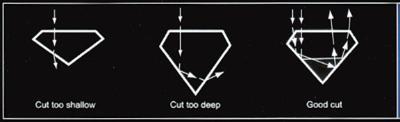 Refers to the angles and proportions of a diamond. Based on scientific formulas, a well-cut diamond will internally reflect light from one mirror-like facet to another and disperse and reflect it through the top of the stone. This results in a display of brilliance and fire, thereby placing well-cut diamonds higher on the Diamond Quality Pyramid than deep or shallow-cut diamonds. Diamonds that are cut too deep or too shallow lose or leak light through the side or bottom, resulting in less brilliance and ultimately, value.
